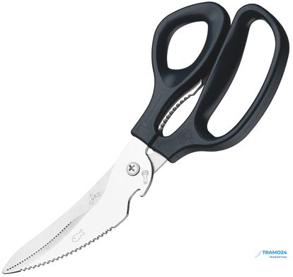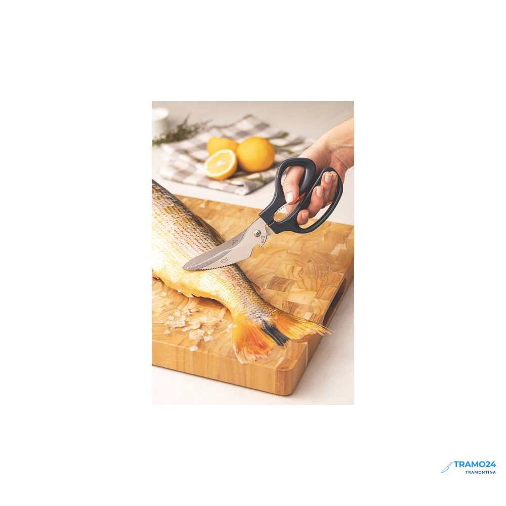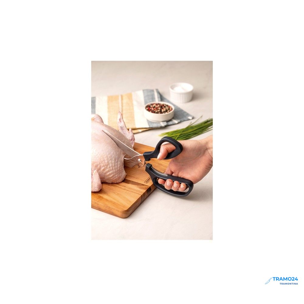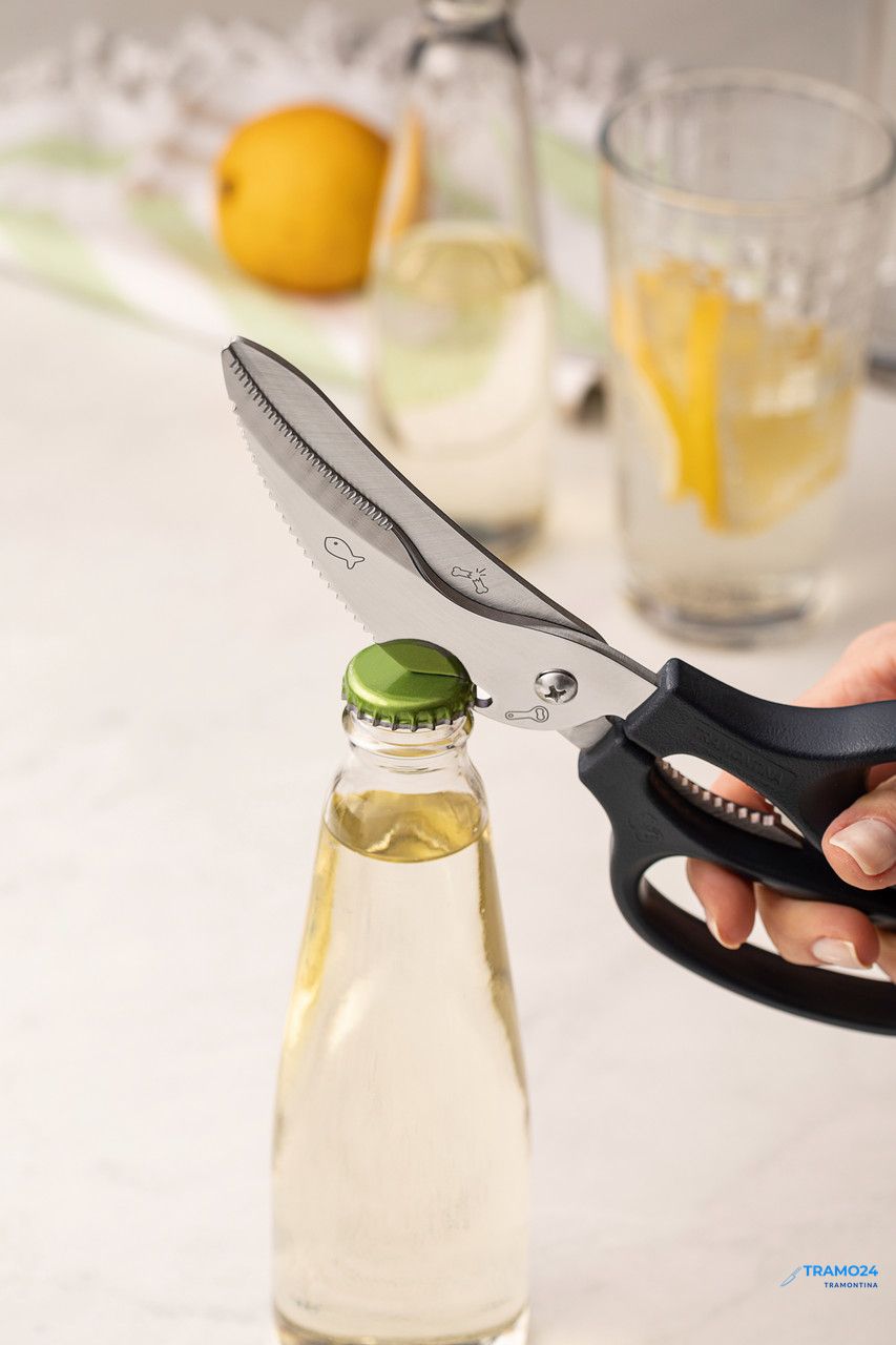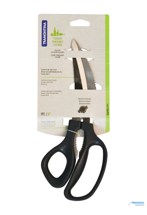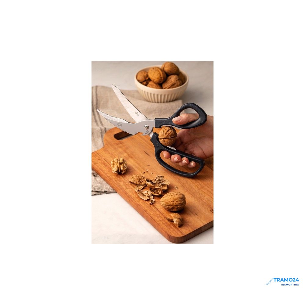 Многофункциональные кухонные ножницы Tramontina Supercort справятся с нарезкой зелени, раскалыванием орехов, открыванием металлических пробок бутылок, чисткой и разделкой рыбы, разделкой курицы. Очень удобно ложатся в руку. Полностью разбираются, что дает возможность идеально их вымыть после каждого использования. Разрешено мытье в посудомоечной машине.